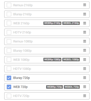 In the following screenshot, you will see a downgrade order of your Quality Sources where the highest Quality would be a WEB-720p and the lowest quality a Remux-2160p. As always, the upgrade order would be from bottom to top. (direction of the arrow)
