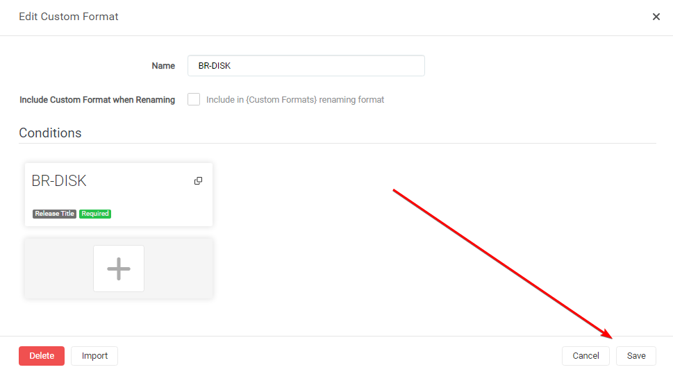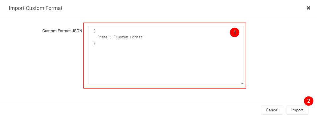 In the empty Custom Format JSON box (1) you just paste the JSON that you got from the Custom Format Collection or provided to you from other sources followed by the Import button (2).